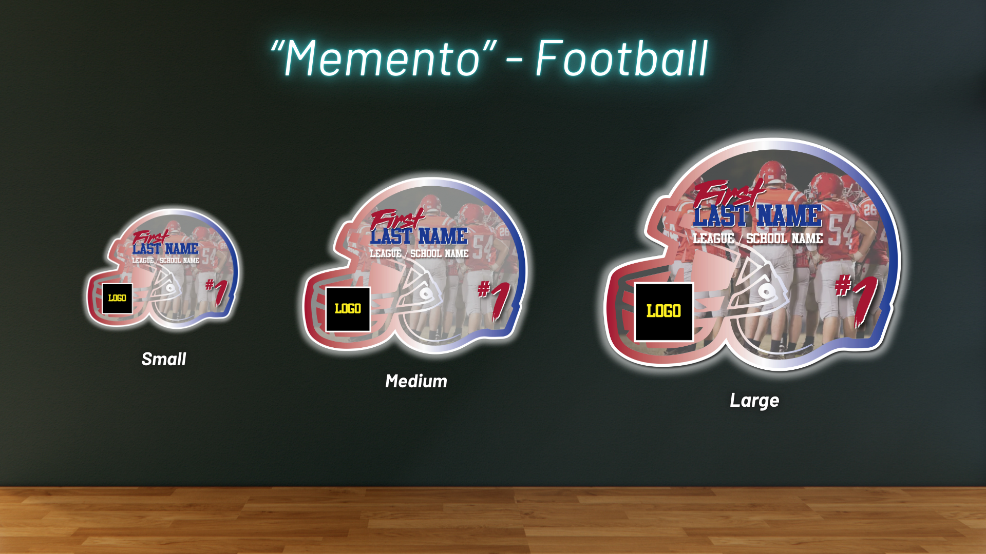Remember your achievements with a football Memento, featuring an action shot, name, and number on a bold helmet-themed design.