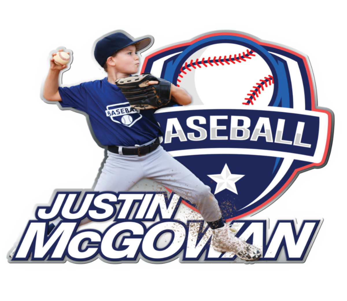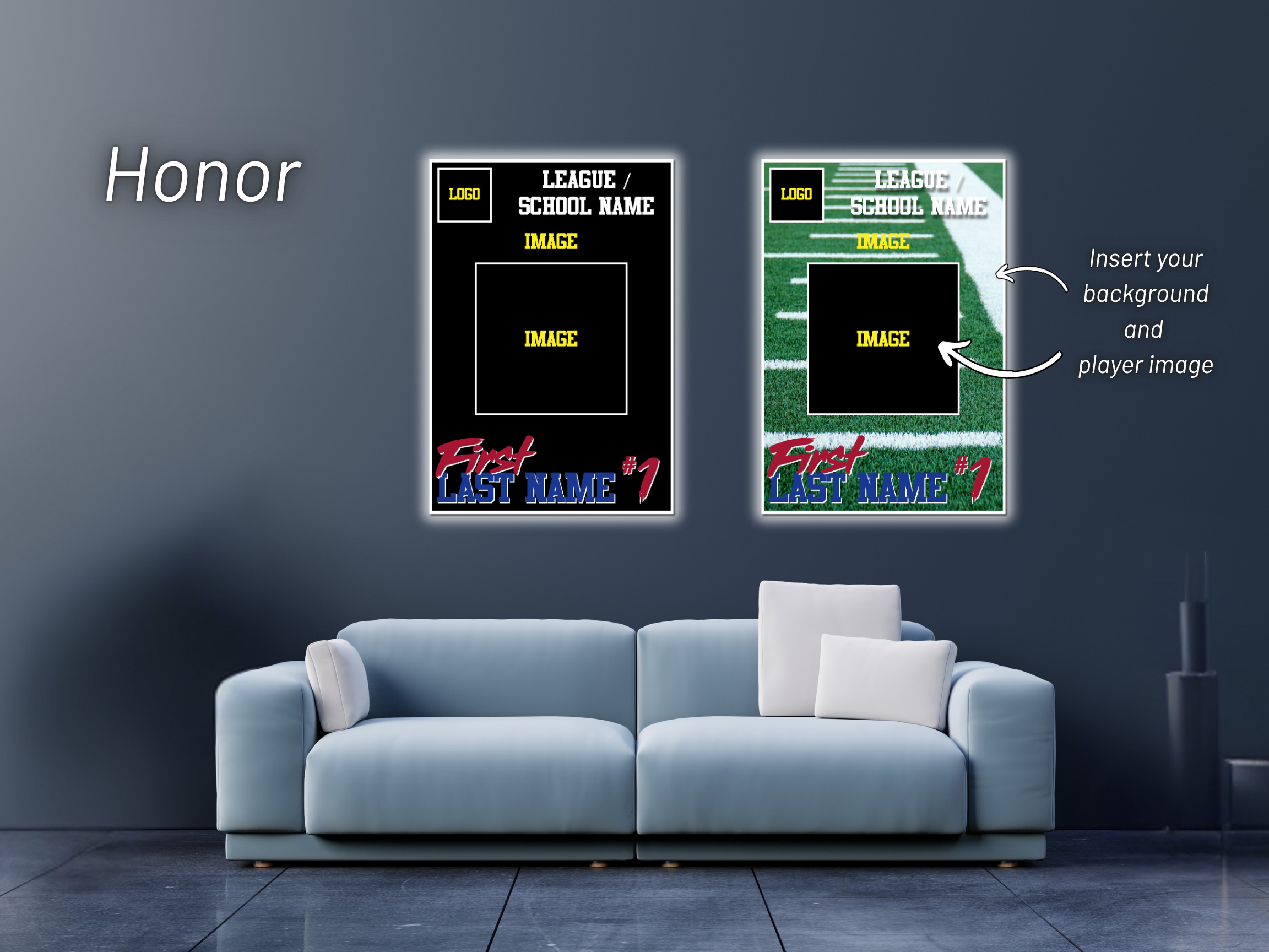 A dynamic, sports-themed design that places your athlete’s image inside a larger sports shape, adding depth and vibrancy to create a tribute to their success.
