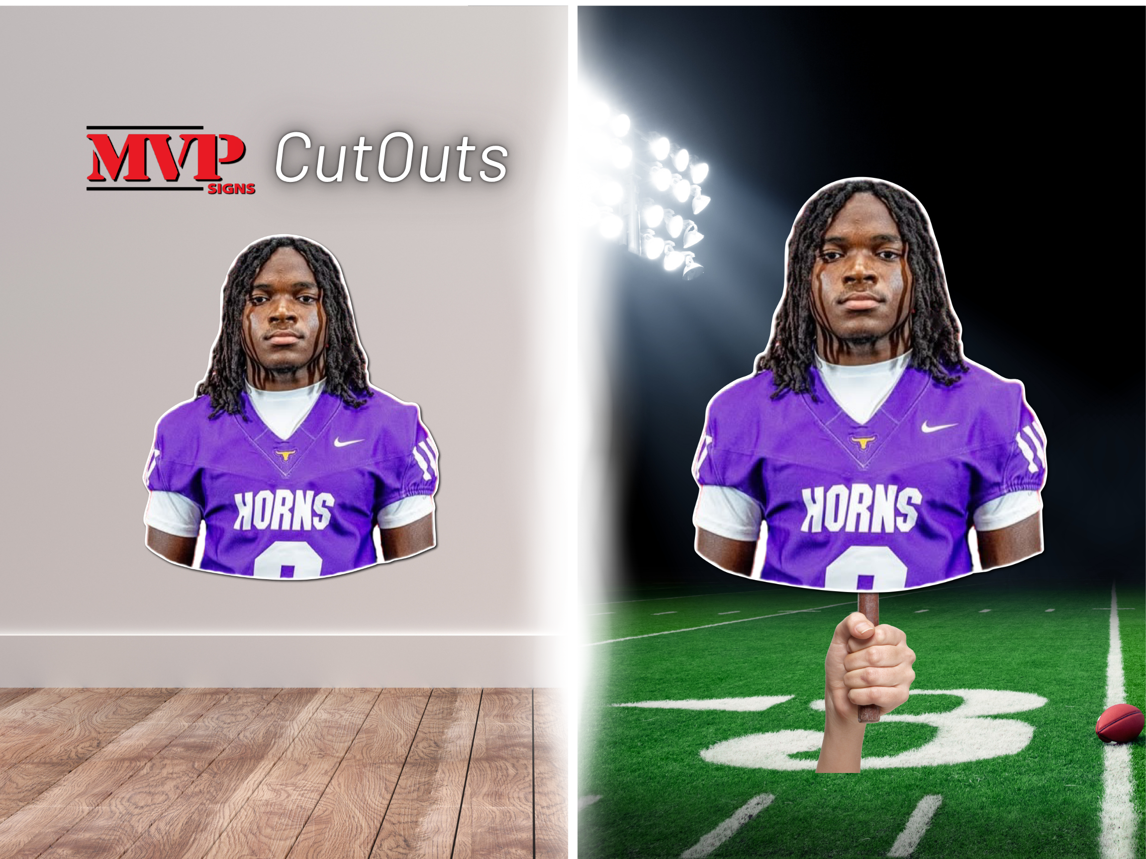 Made from durable Coroplast, these high-quality cutouts are perfect for displaying at home, at games, or events.
